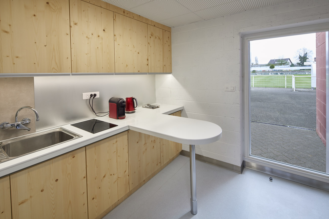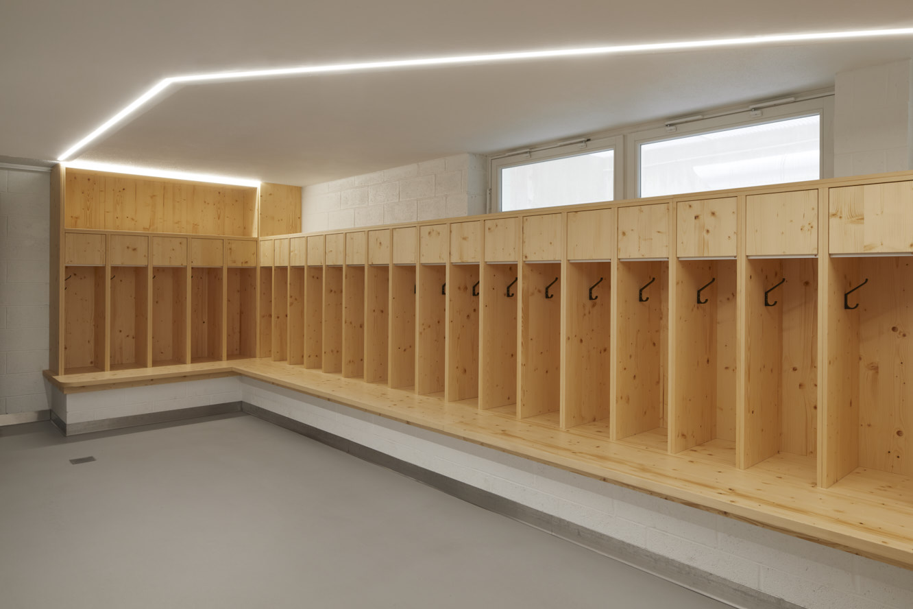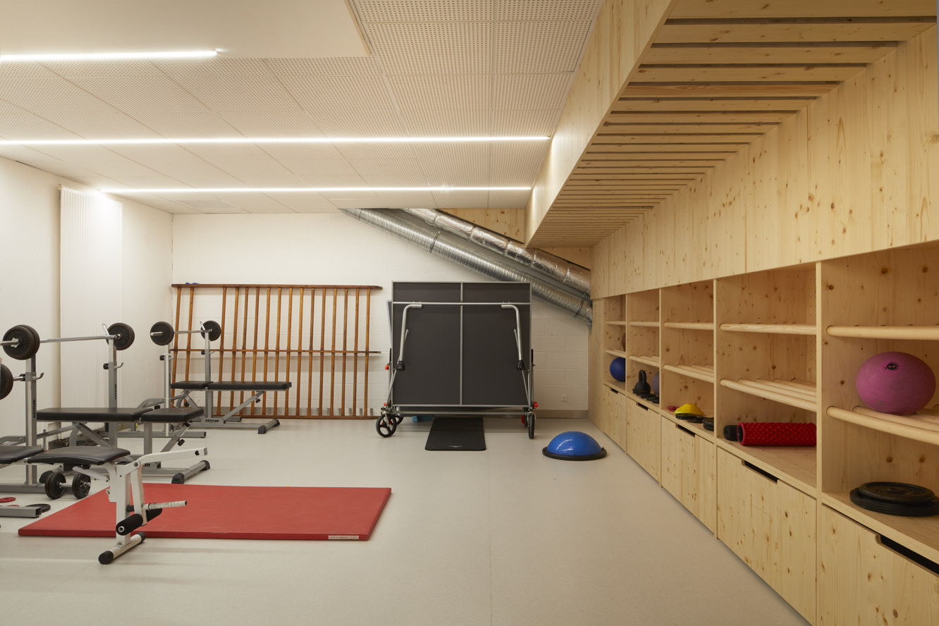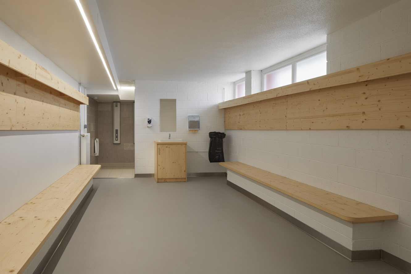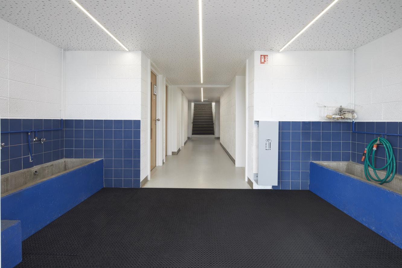 Les vestiaires et douches aménagés sous les tribunes, construit en 1993 étaient usés, et non conformes aux exigences thermiques d’aujourd’hui. Ces travaux, intérieurs, n’impactent nullement le fonctionnement du stade ni les façades. Les vestiaires sont conservés mais transformés afin d’essayer de gagner de la place dans une surface réduite par l’isolation intérieure. Les performances de salle de musculation sont améliorées thermiquement par une ventilation double flux dédiée, un traitement acoustique global intégrant les rangements des agrès. Les locaux sont isolés de l’intérieur par des matériaux biosourcés, doublés de maçonnerie, de nouvelles portes et fenêtres. Les dispositifs de traitement d’air, la production d’eau chaude, l’éclairage sont repensés, puisque manifestement HS. Les choix des matériaux de finition, dictés par l’inondabilité des locaux, et la rudesse des joueurs, militent pour des choix simples, robustes, en matériaux bruts (bois multiplis, agglo bétons, sol pvc grands trafics). Les détails des aménagements intérieurs ont tous été dessinés dans un esprit d’ergonomie, de fonctionnalité, de pérennité pour leur confèrerer une esthétique durable. Les filières de ré-usages et de fin de stock sont mises à contribution et une entreprise de réinsertion aura la charge de leur mise en œuvre.