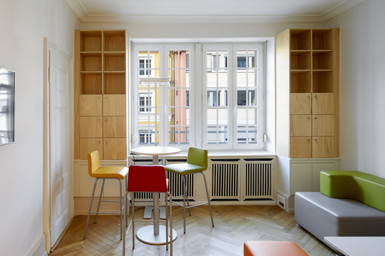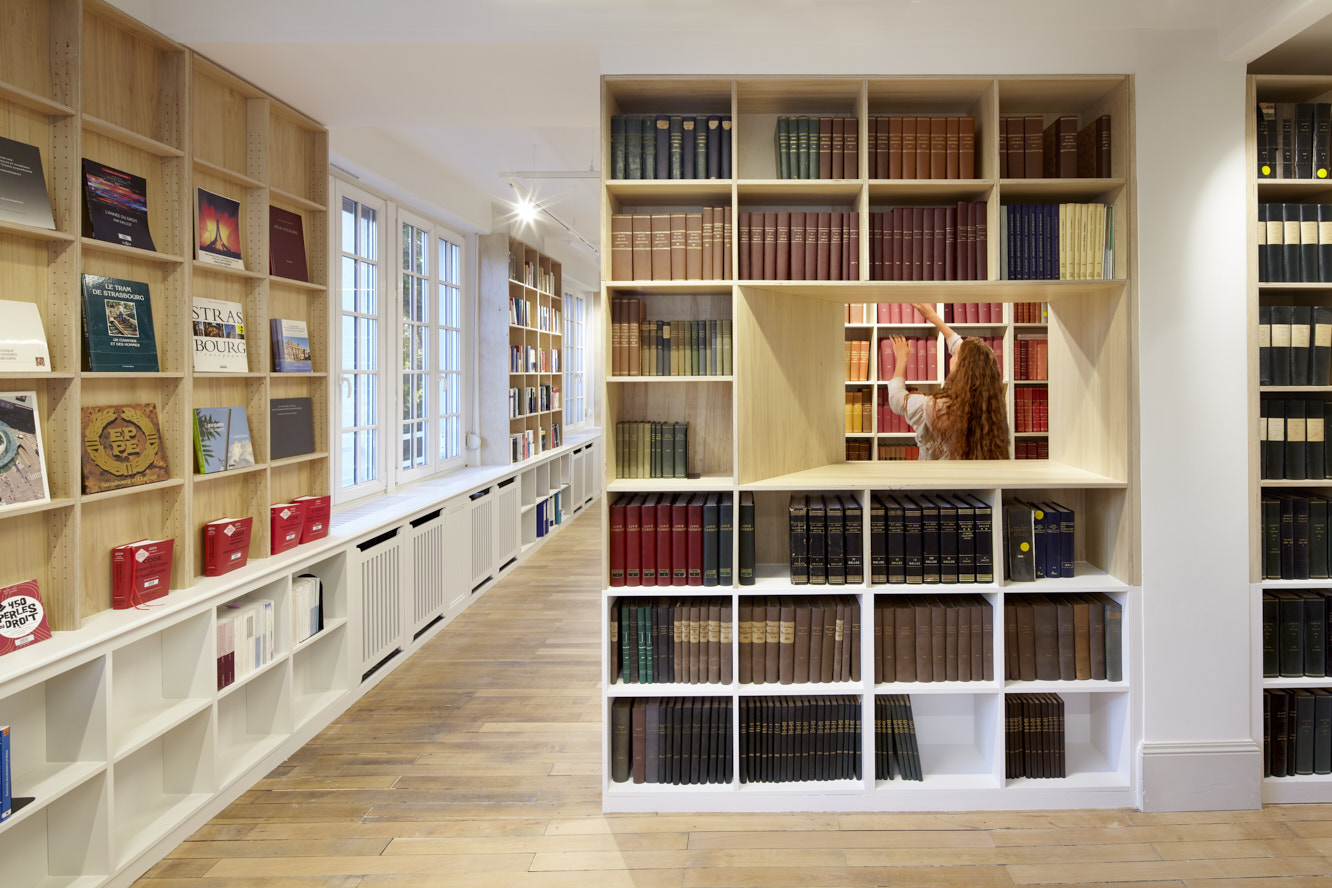 Chaque plateau est composé de larges salles ouvertes sur les rues environnantes, la particularité du site, pourtant dans l’hypercentre de Strasbourg offre des qualités lumineuses naturelles Nord Sud et Est. Les plafonds d’une hauteur supérieure à 3,5 m conservaient leurs moulures masquées pour la plupart au-delà de plafonds industriels démontables., les sols d’origines en parquets, (bordés de hautes plinthes moulurées) étaient masqués par des couches de revêtements successifs. Les radiateurs en fonte en allège étaient encoffrés dans des menuiserie travaillées.