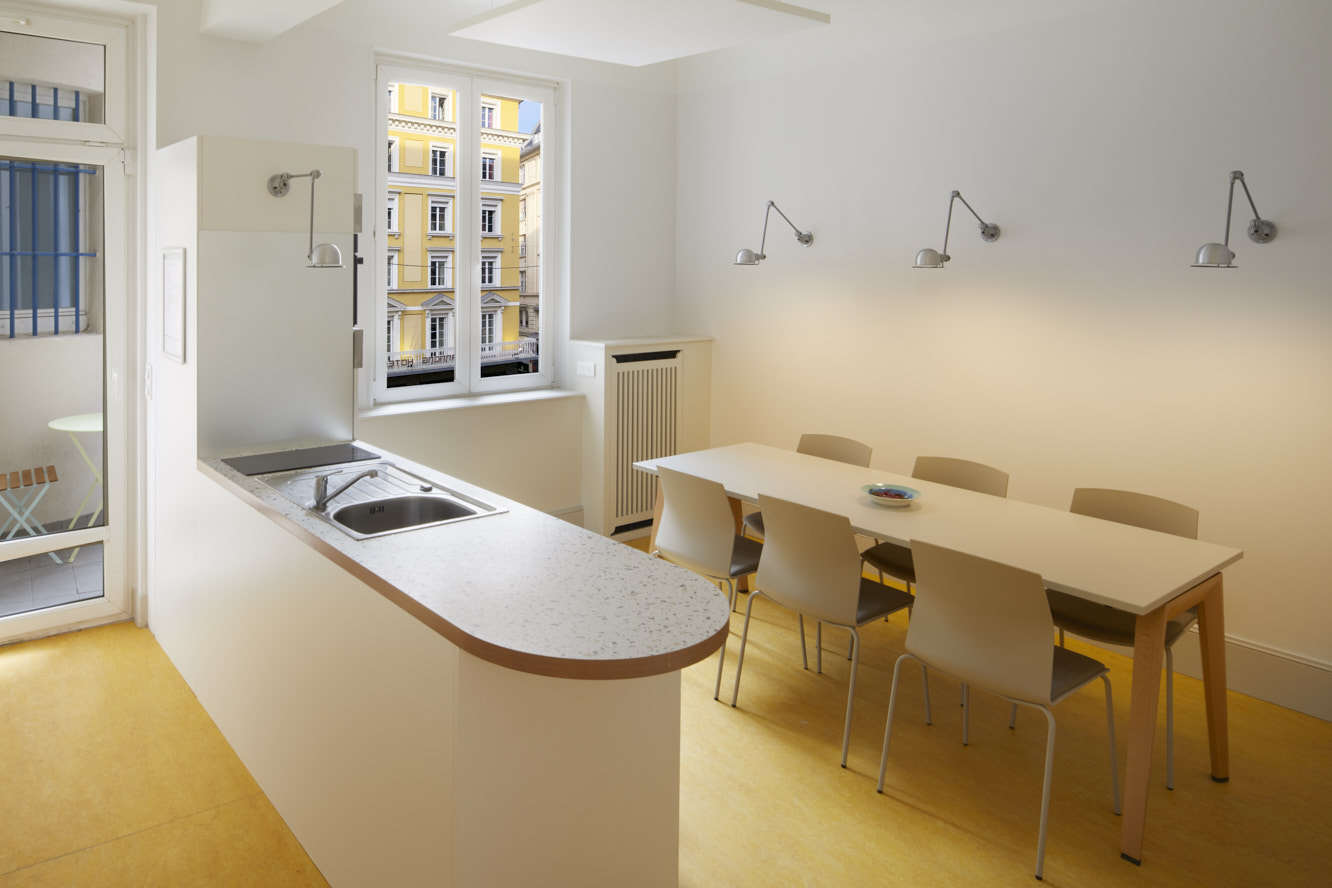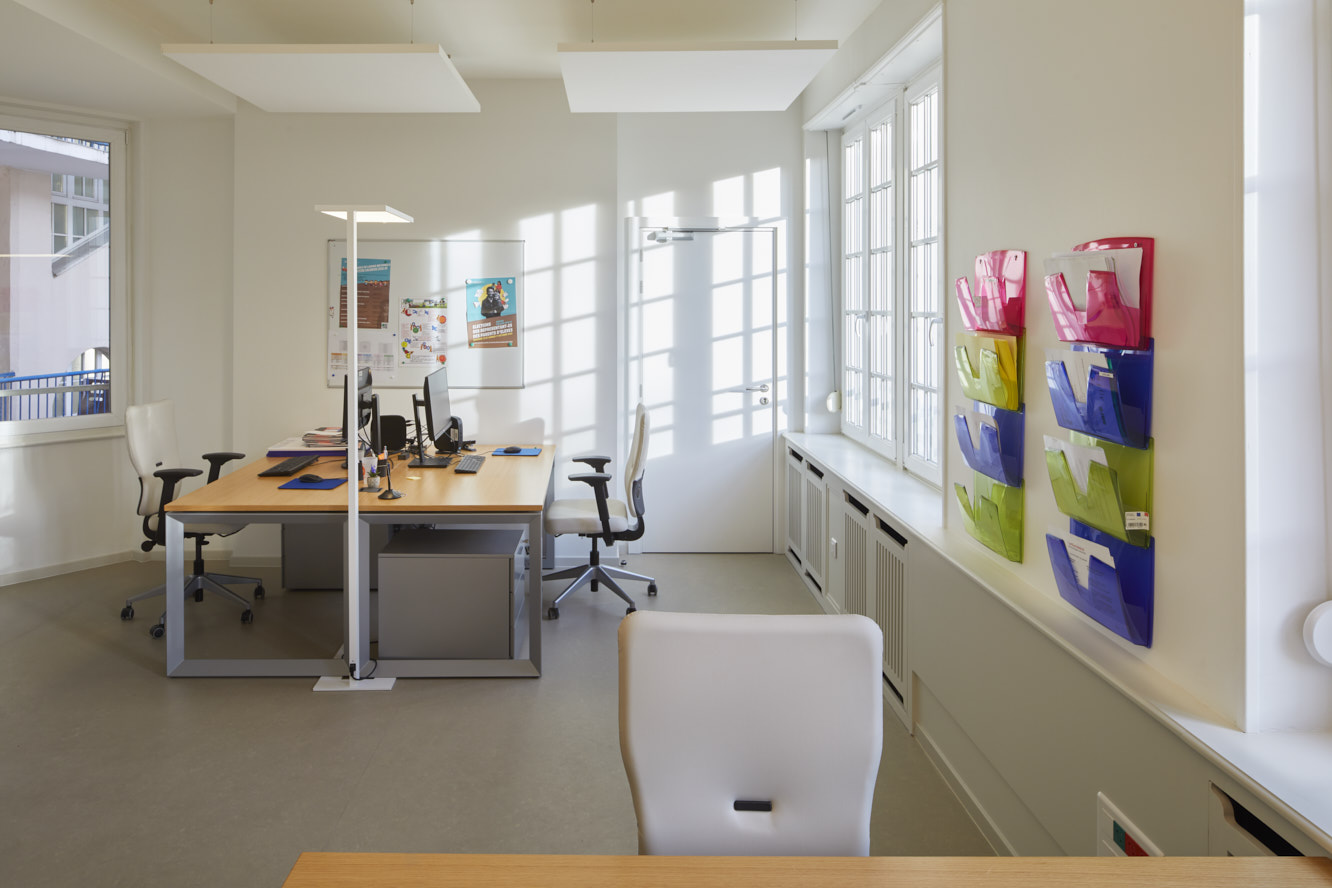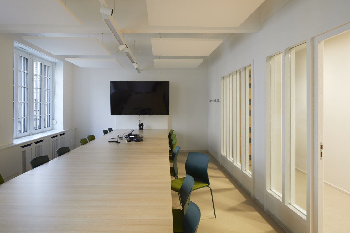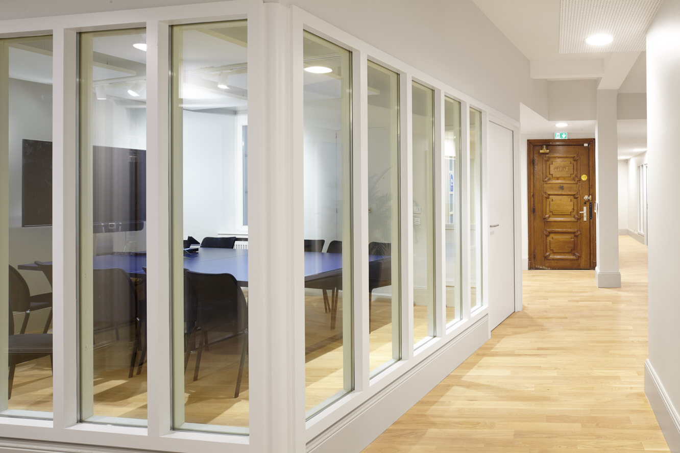 Mais comme conserver c’est transformer, les nouveaux besoins de cloisonnements, respectant les trames et le rythme de fenêtres, ont été agrémenté de châssis vitrés intérieurs, donnant lumière naturelle aux couloirs et vue aux bureaux depuis les circulations.